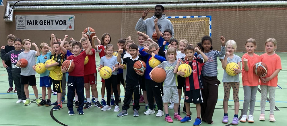 Vor knapp zwei Wochen hatten wir Gäste der Aschaffenburg Baskets bei uns an der Schule, die mit den Kindern der Grundschule einen sportlichen Vormittag im Zeichen des Basketballs verbracht haben.